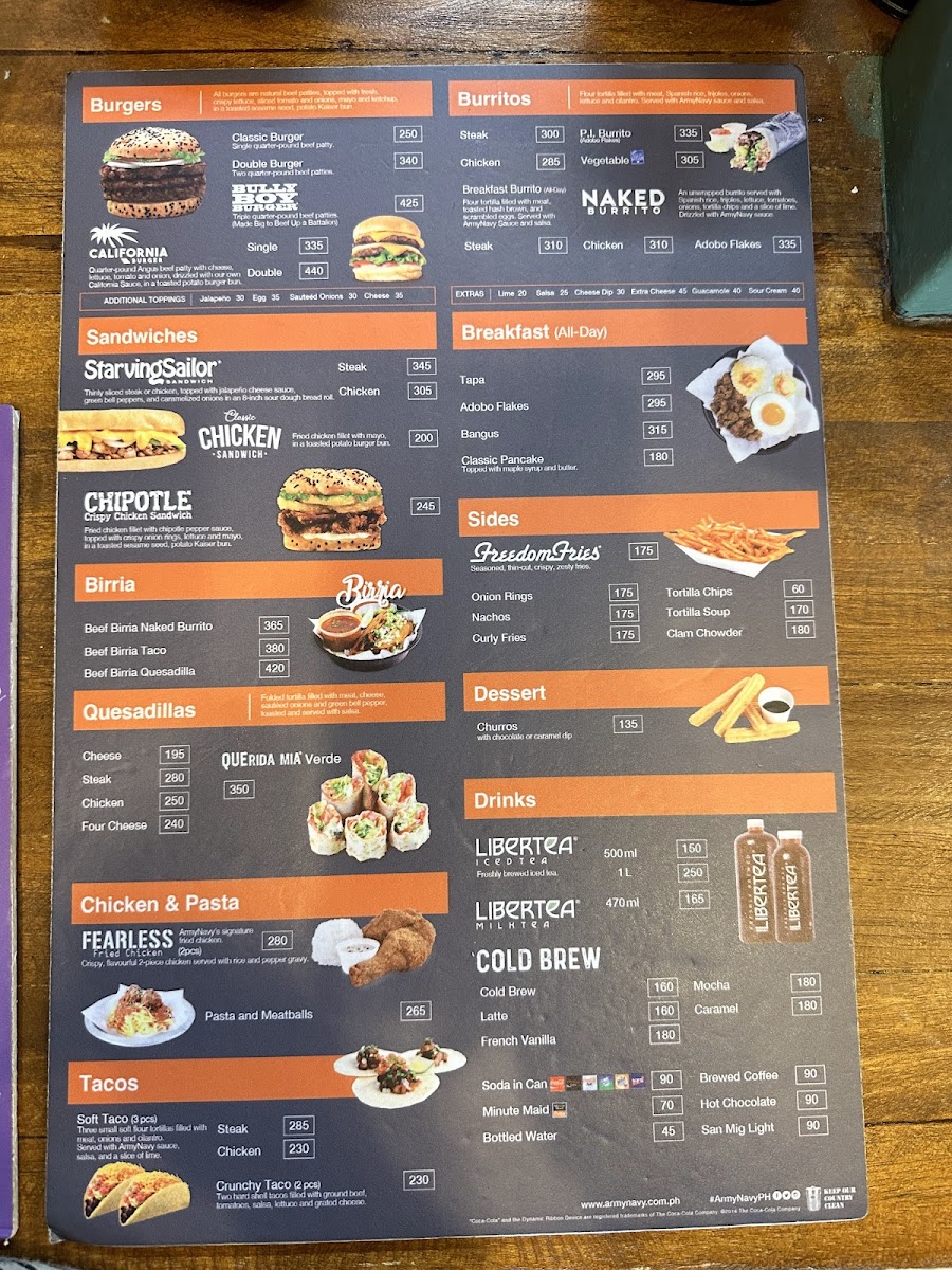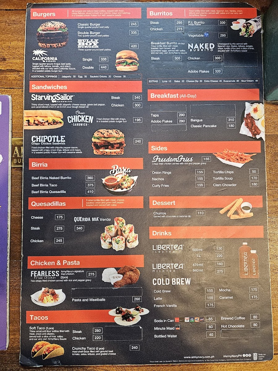 Welcome to ArmyNavy Burger Burrito, a unique fusion eatery located in the heart of Cebu City. This vibrant restaurant at Ayala Center proudly offers a diverse menu that combines classic American burger traditions with rich Filipino and Mexican flavors.